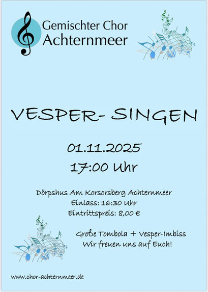 Doch zuvor laden wir Euch ganz herzlich zu unserem "Vesper-Singen" am 01. November ins "Dörpshus Zum Korsorsberg" in Achternmeer ein. Zusammen mit befreundeten Chören möchten wir Euch ab 17 Uhr ein paar unterhaltsame Stunden bereiten. Neben zahlreichen Liedbeiträgen erwartet Euch eine große Tombola und ein paar kulinarische Häppchen für das Wohlergehen von Körper und Seele.